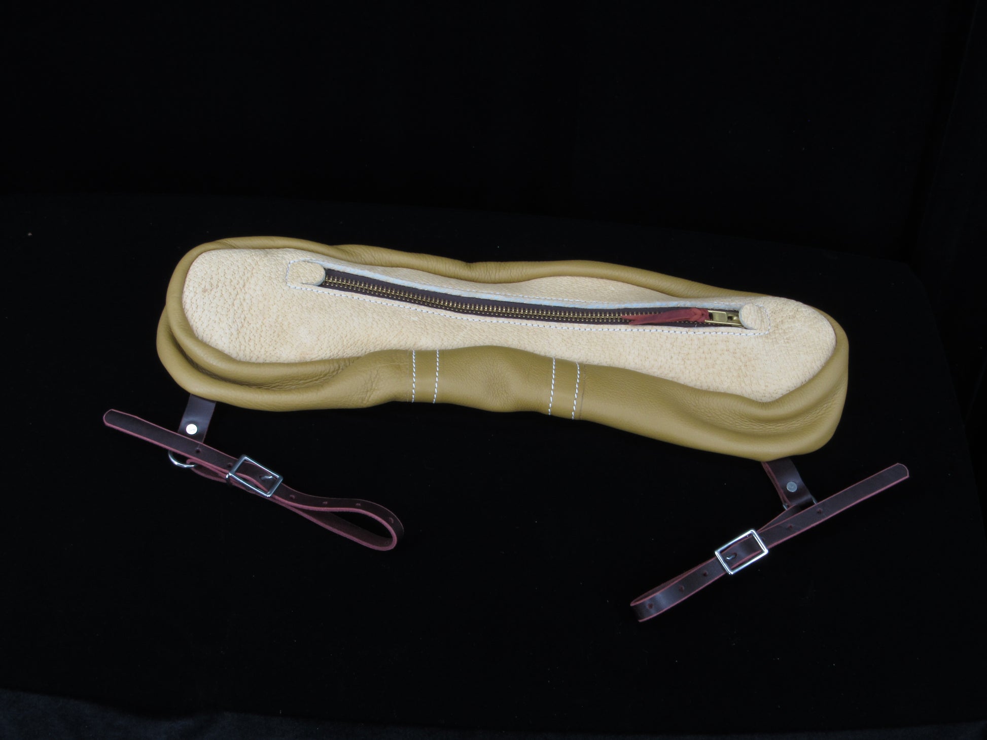 Very handy, low profile way to carry essential supplies. Boar hide top with chap leather gusset and latigo straps.