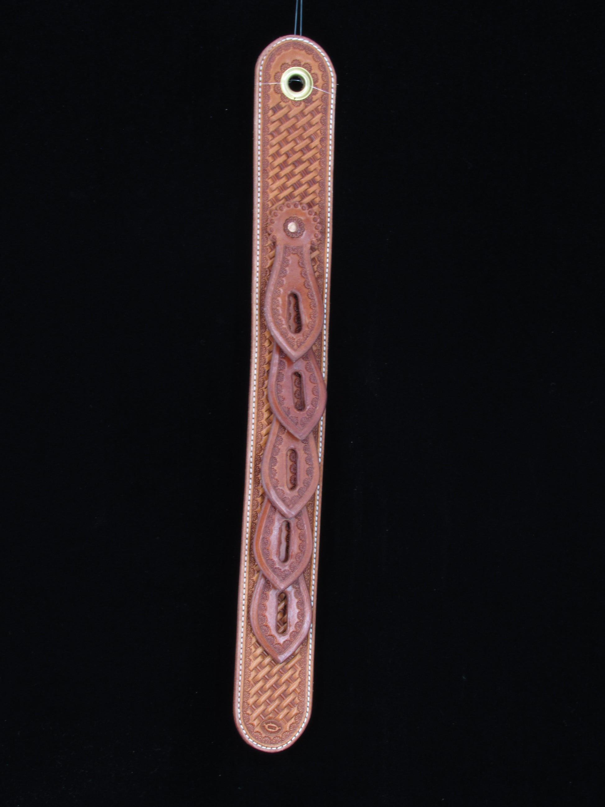 Introducing the Cinch Hanger/Organizer - the ultimate tool for organizing your cinches. Made with tooled leather, it can hold up to five cinches and features a reinforced hanging hole for durability. Keep your cinches in place and easily accessible with this innovative hanger.