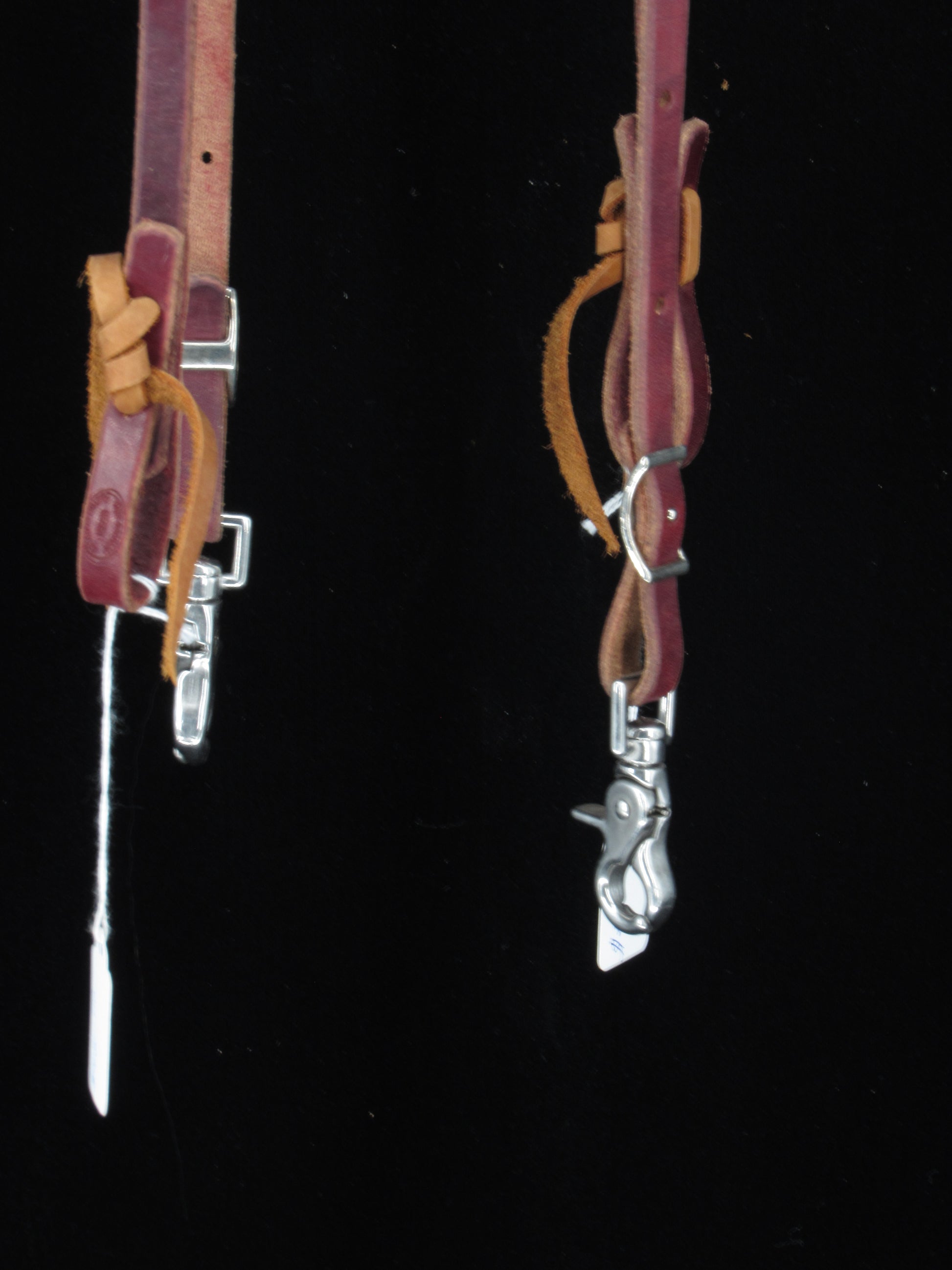 Latigo Roping Reins are 1/2" wide and 7' long, made with hot waxed latigo leather for added durability. The stainless steel snap on one end allows for easy attachment, while the water tie loop on the other provides a secure attachment.