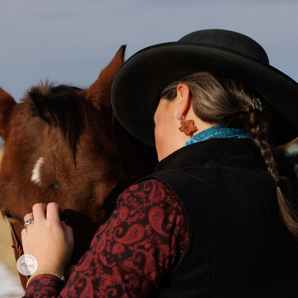 Crafted from lightweight, hand tooled leather, these earrings feature a unique floral design that exudes western elegance and cowgirl sophistication. With intricate hand painted detailing and a unique texture, these, lightweight earrings are the perfect accessory for any occasion. Elevate your style with these beautiful, one-of-a-kind leather earrings.