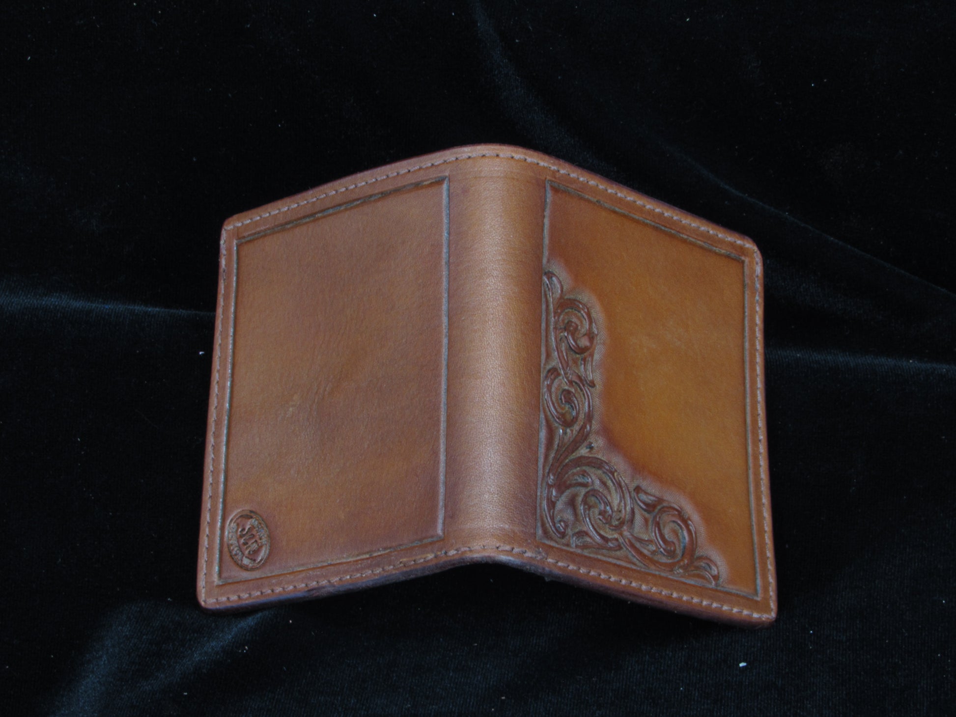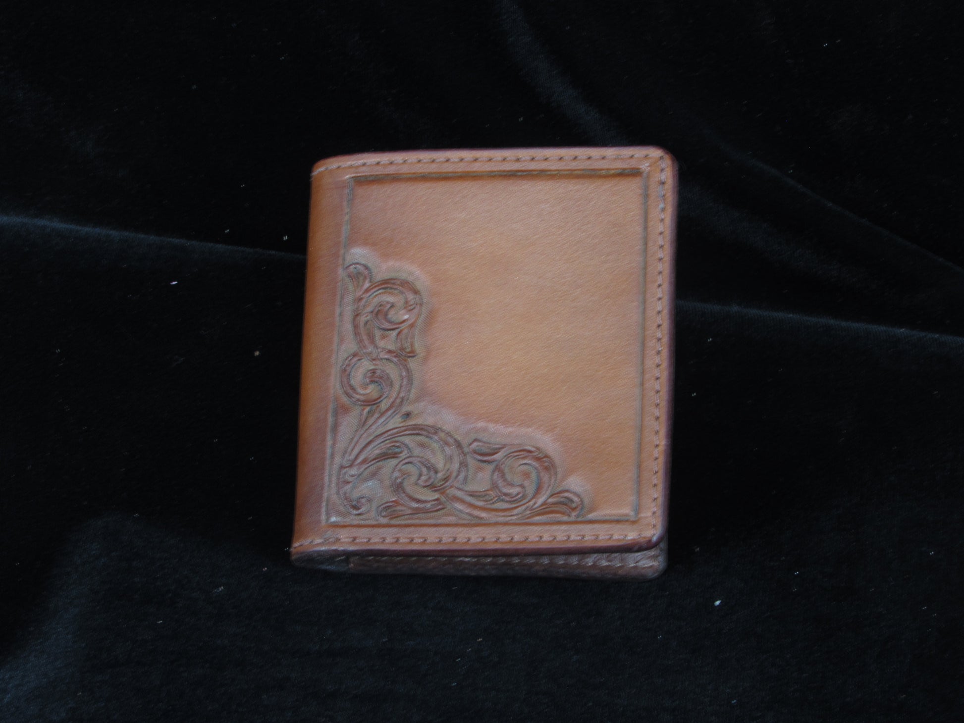 Introducing our Minimalist Bi-fold Wallet, designed with a unique scroll hand-tooled in the corner. This sleek wallet features a clear ID pocket, two card pockets, and a space for cash, all lined with durable leather. Keep your essentials organized in style.