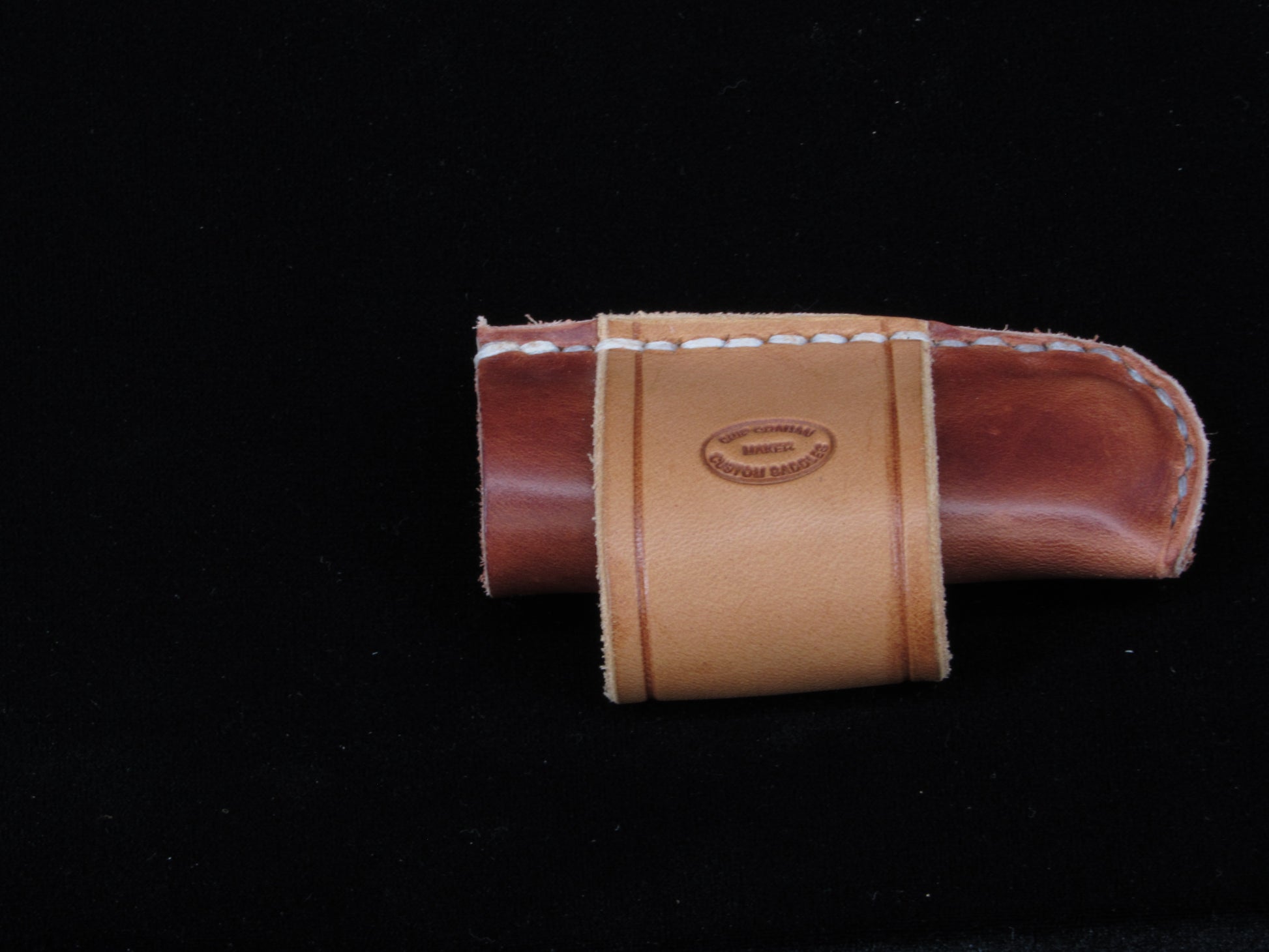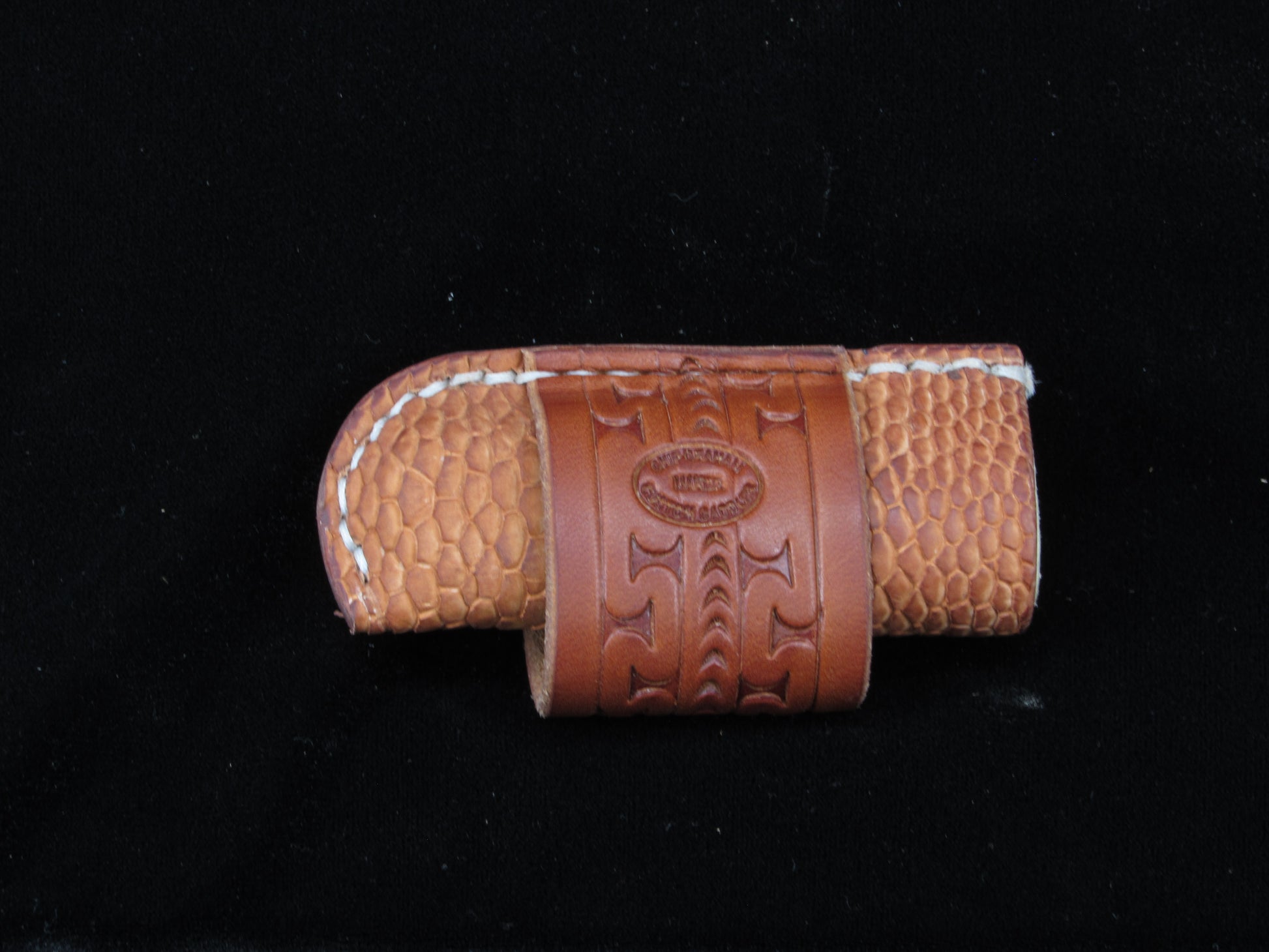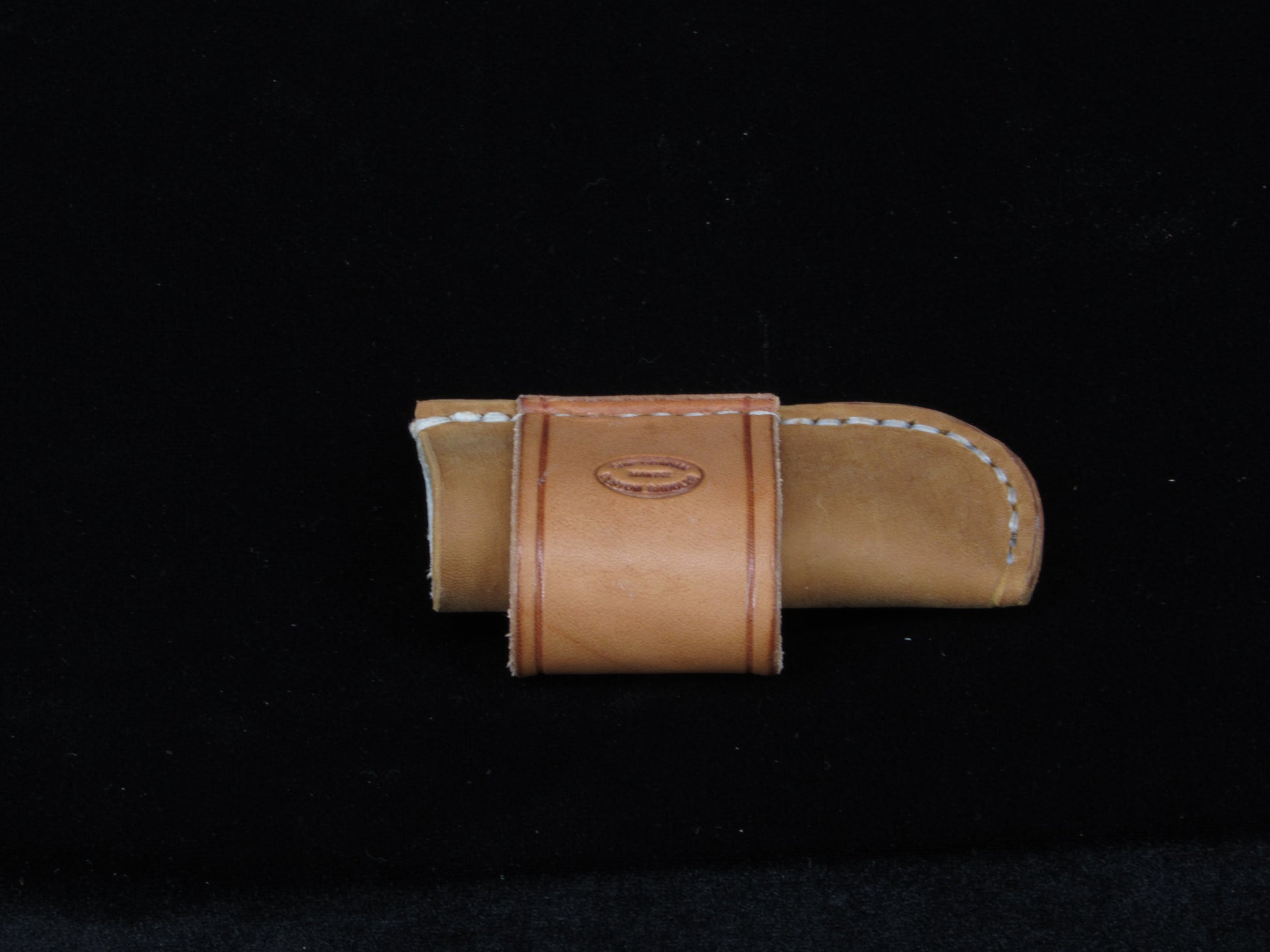 These compact horizontal pocket knife sheaths provide convenient access while securely holding your knife with a rawhide lip lock. Crafted from durable chap leather for an economical choice or premium beavertail leather for a refined appearance, they accommodate belts up to 1 1/2" wide. Designed to fit knives like the Moore Maker or Case Trappers measuring 4 1/8" long, 7/8" wide, and 1/2" thick, these sheaths combine practicality with tailored craftsmanship.