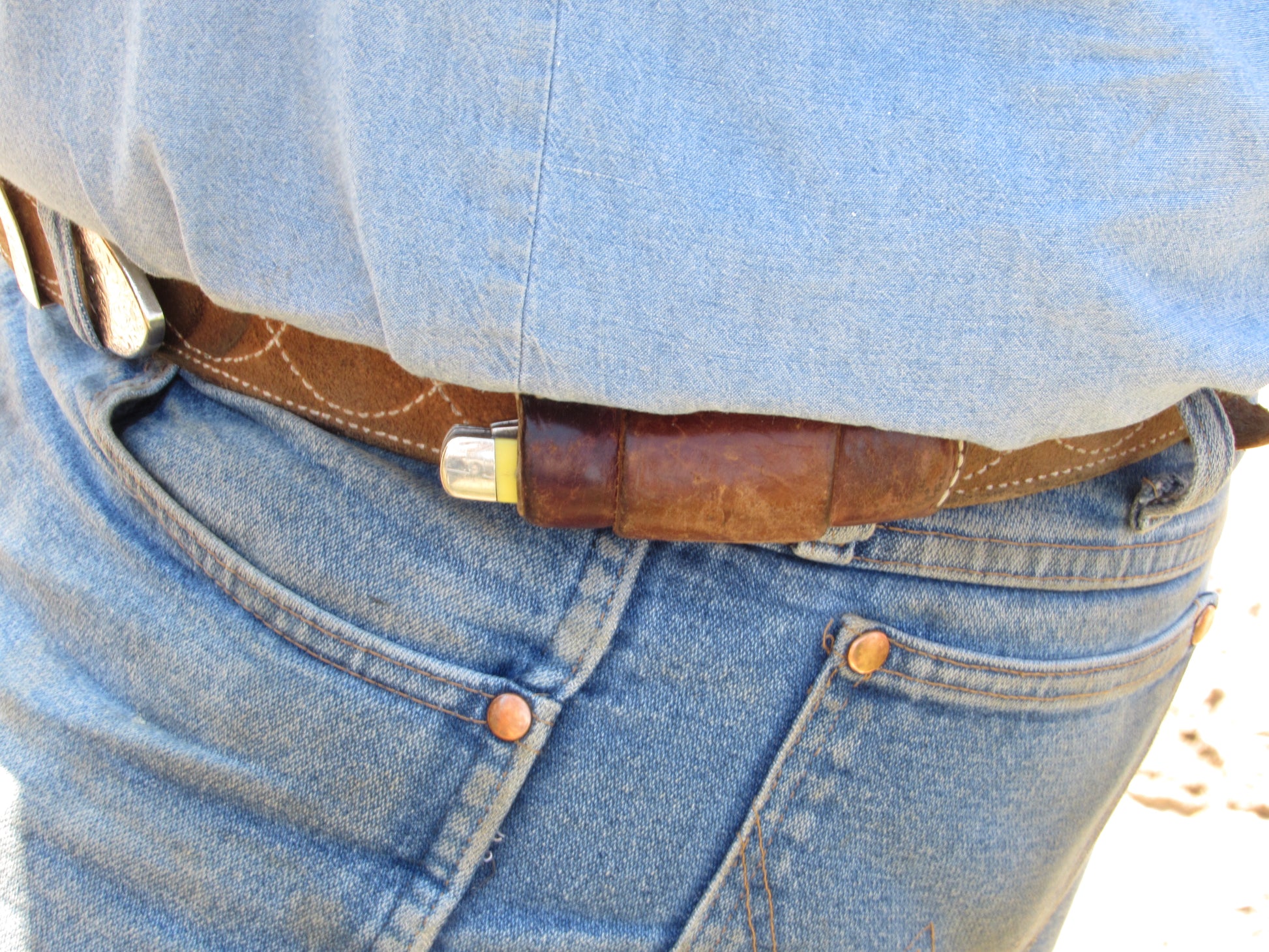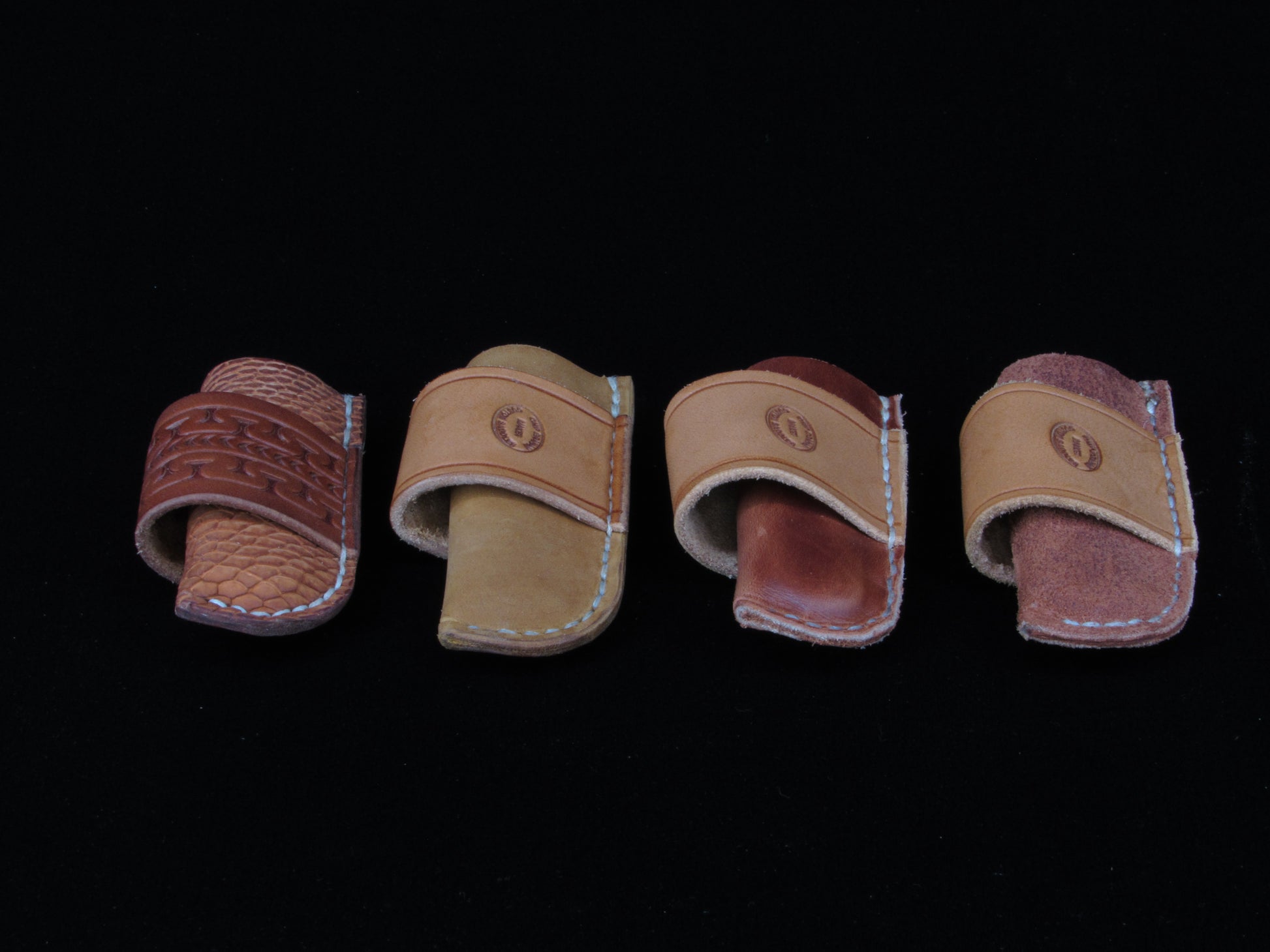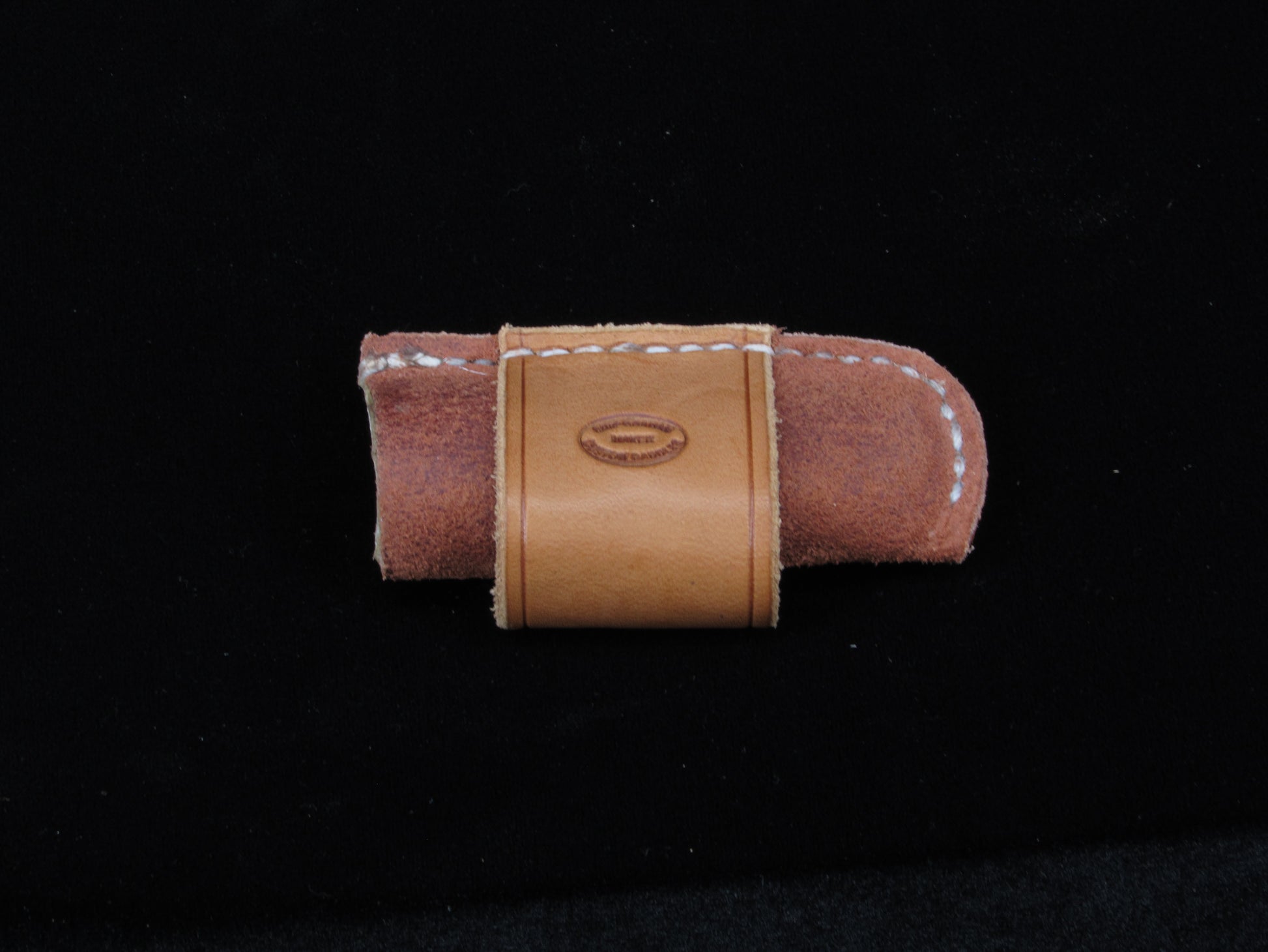These compact horizontal pocket knife sheaths provide convenient access while securely holding your knife with a rawhide lip lock. Crafted from durable chap leather for an economical choice or premium beavertail leather for a refined appearance, they accommodate belts up to 1 1/2" wide. Designed to fit knives like the Moore Maker or Case Trappers measuring 4 1/8" long, 7/8" wide, and 1/2" thick, these sheaths combine practicality with tailored craftsmanship.