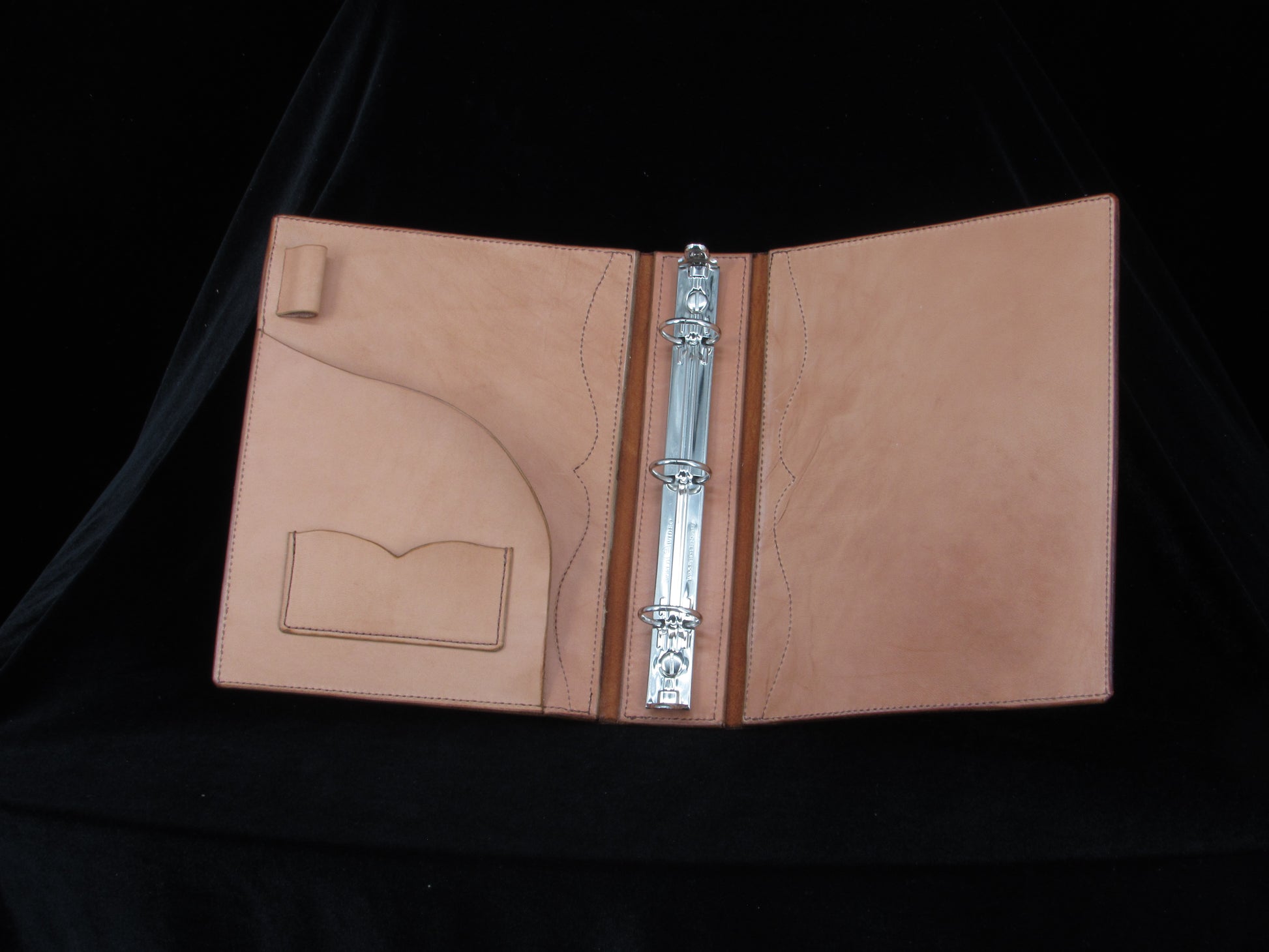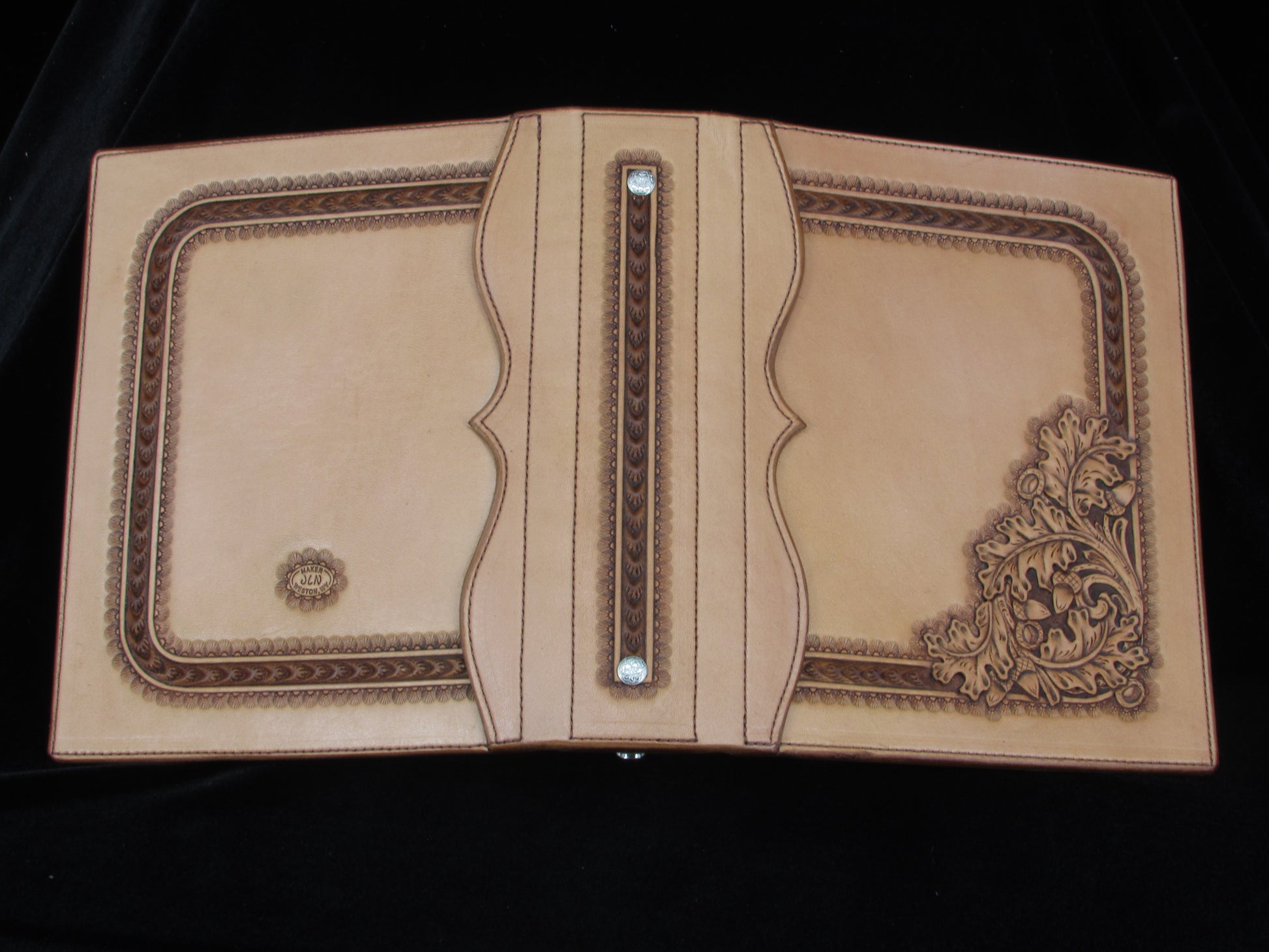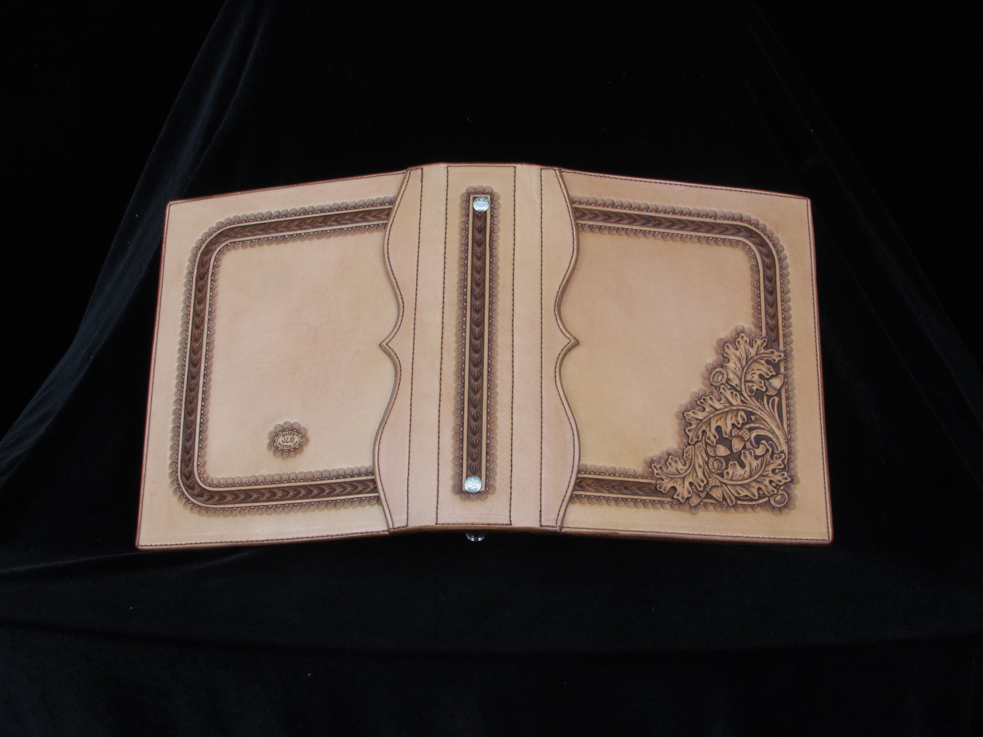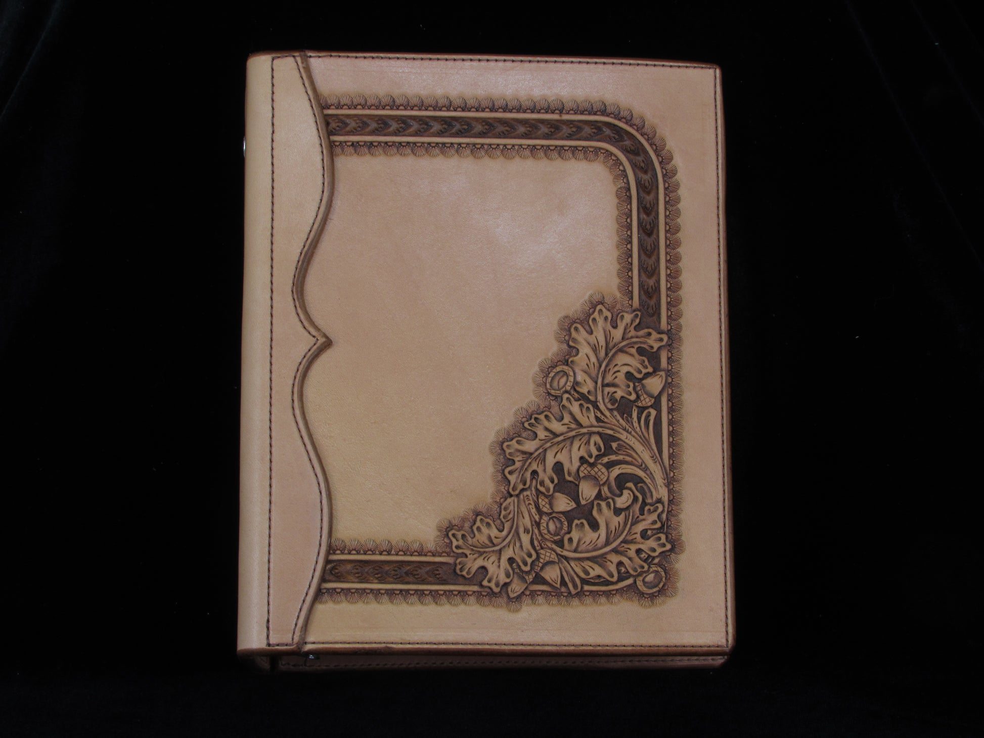 Experience quality and style with our Small 3 Ring Binder. Crafted with expert hand-tooling, this mini binder showcases a unique oak leaf corner design and a running wheat border. It's perfect for 5 1/2" x 8 1/2" pages on 1" round rings, and includes a pen loop, business card pocket, and flap pocket for added convenience. Elevate your organization game today.